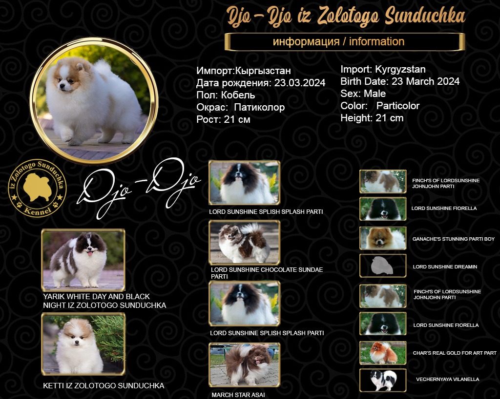| Импорт: Разновидность: Цвергшпиц / Померанский шпиц Дата рождения: 23.03.2024 Пол: кобель Окрас: Патиколор Рост: | Import: Type: Zwergspitz / Pomeranian Birth Date: 23.03.2024 Sex: male Color: Particolor Height: |