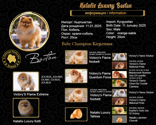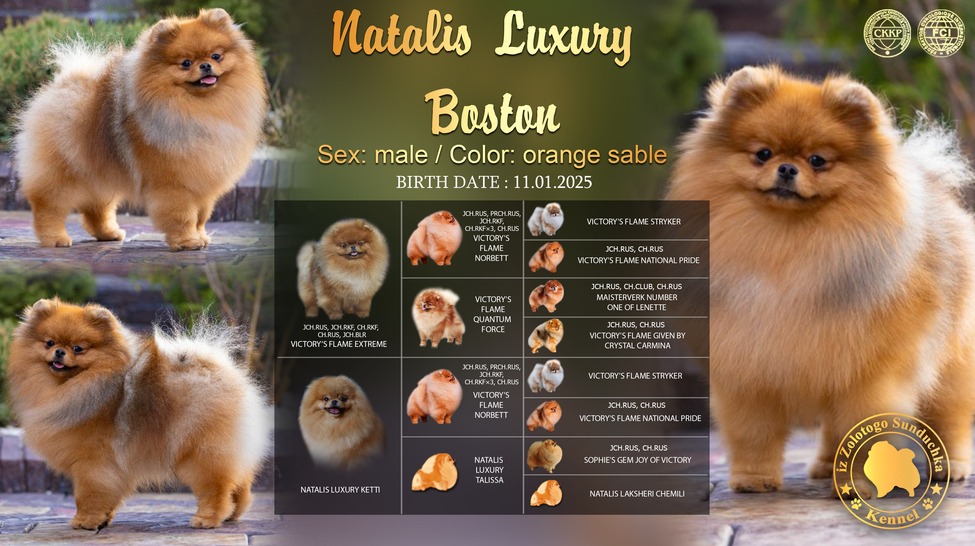 | Импорт: Разновидность: Цвергшпиц / Померанский шпиц Дата рождения: 11.01.2025 Пол: кобель Окрас:оранжево-соболинный Рост: | Import: Type: Zwergspitz / Pomeranian Birth Date: 11.01.2025 Sex: male Color: orange sable Height: |